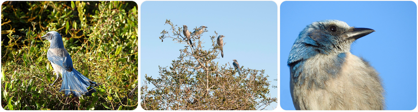 Scrub jays are highly intelligent and social birds. They often live in family groups and are known for their curiosity, sometimes approaching hikers or landing nearby.