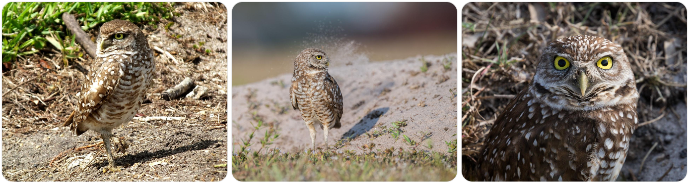 Burrowing owls are small, long-legged owls that live in open, dry areas such as grasslands, prairies, and even urban spaces like vacant lots and golf courses in parts of Florida.